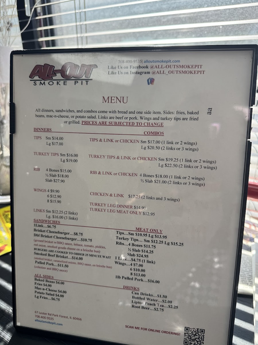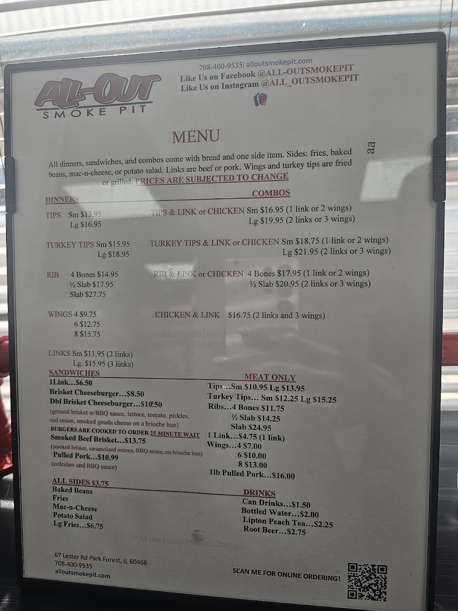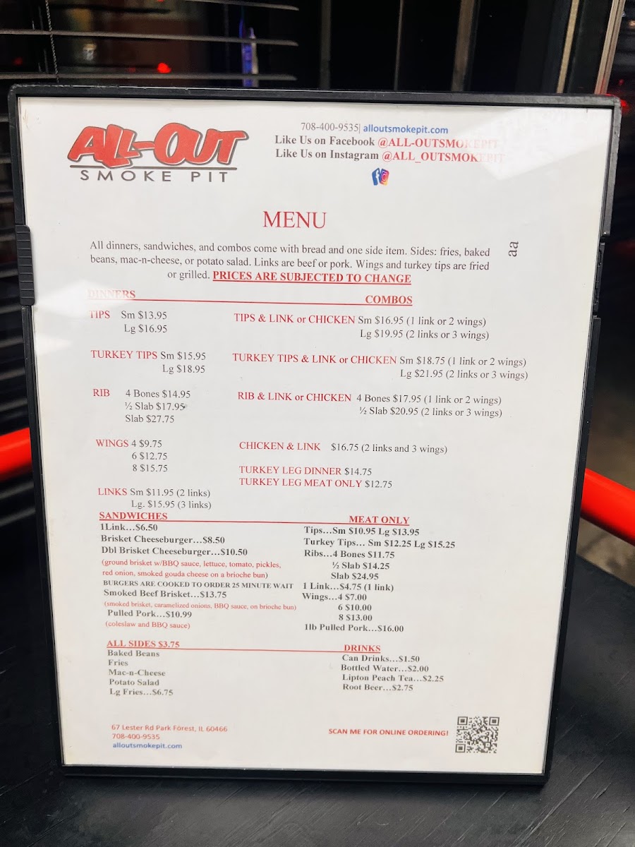 Welcome to All-Out Smoke Pit, a haven for BBQ lovers nestled in Park Forest, IL. This takeout-only joint specializes in smoky, flavorful dishes that keep patrons coming back for more. With an enticing menu anchored by their Pulled Pork Sandwich topped with coleslaw and BBQ sauce, there's something for everyone, including the mouthwatering Fried Chicken Sandwich adorned with smoked gouda cheese.